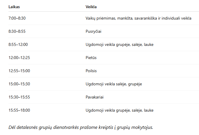Rytas skirtas bendravimui ir judesiui, dienos vidurys – pažinimui, kūrybai ir žaidimams, o popietė – poilsiui ir ramiam pabuvimui kartu.